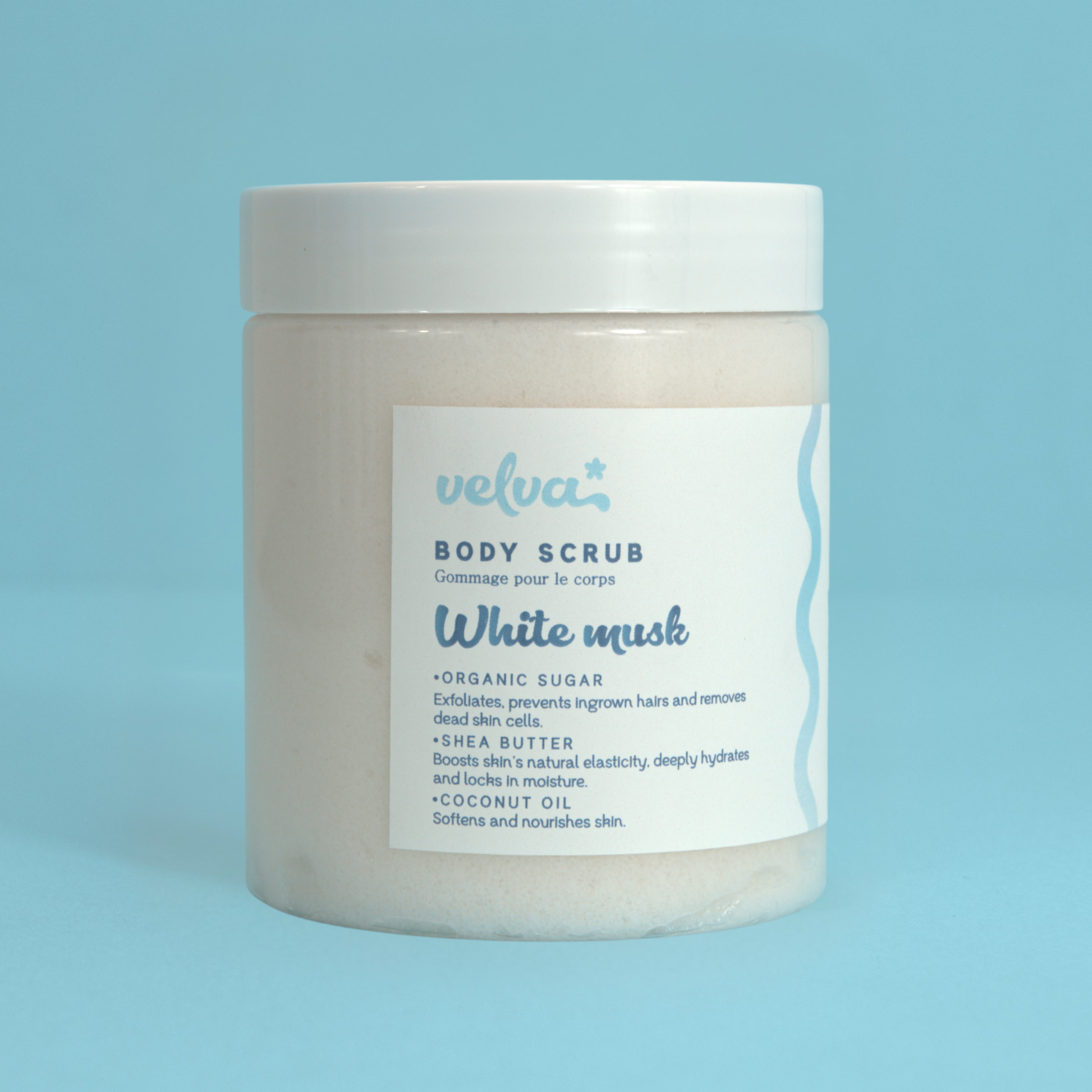 - Step 2: Gently massage the scrub in circular motions on any sore skin, stretch marks, legs, arms, and body using your hand or our Velva loofah.